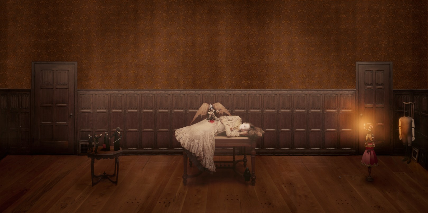 To produce this image, with its aspect ratio mimicking a cinema screen, Anthony started with several separate shots: each individual figure, the room, and even the wallpaper. For the different setups a different