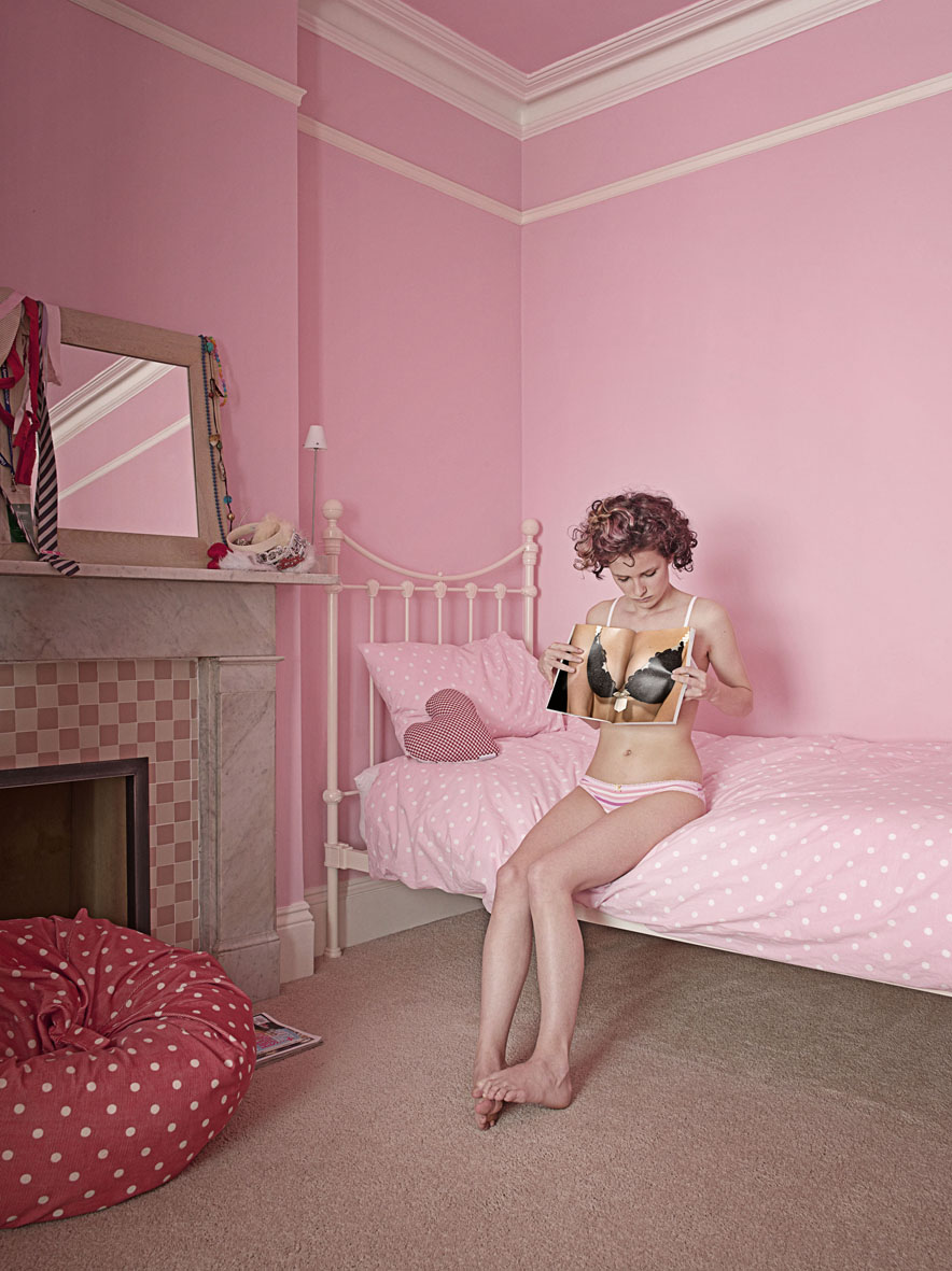 Murray: My lighting varies shoot to shoot, although I think you do see certain themes running through. I tend to be happier with large banks of soft light. For example the shoot of the “boobs” image, it’s a girl’s bedroom, although we changed the tone slightly, we didn’t change the color. Other shots are quite different but on that shot that worked. I used that style the whole way through that series. I had to hire these massive stands to get up that high because the minute you bring the light into the room you change everything. On that “boob” shot there was a large black fiber hanging taking the light off that left hand part of the wall and then there was some smaller blacks doing other little things. You start with a large amount of light then you slowly begin to remove bits of light. That comes really from still-life where you a lot of the time take light away.